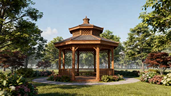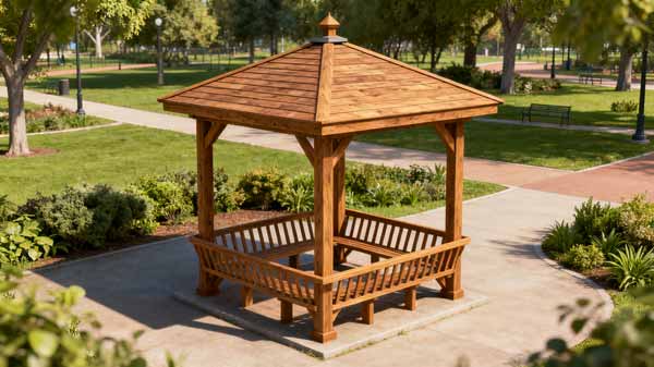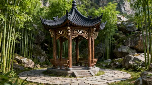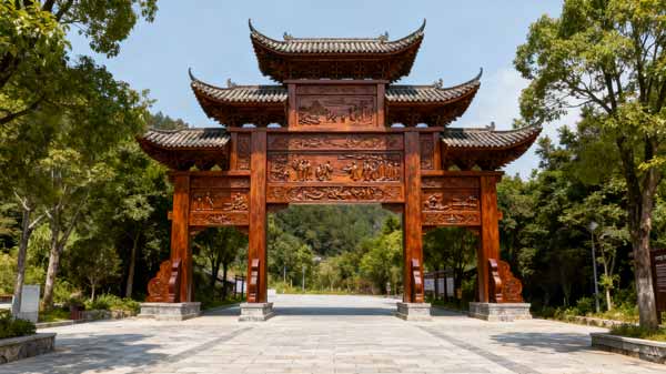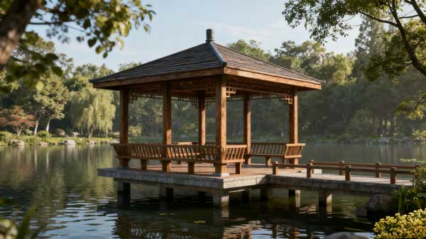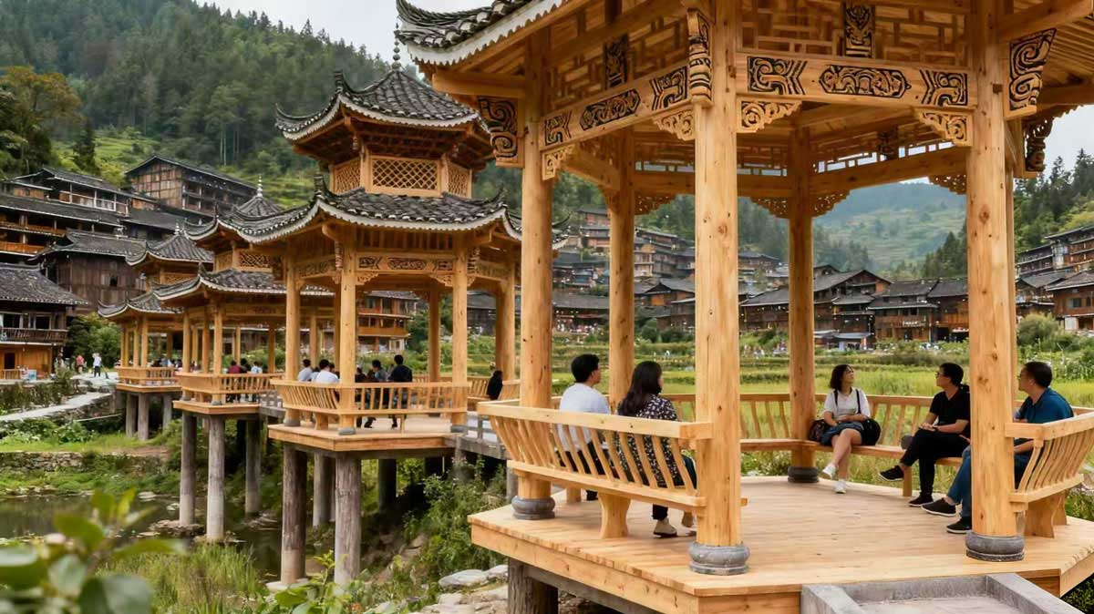 在苗寨景区设计建造 6 座仿古防腐木凉亭,融入苗族建筑元素,选用南方松防腐木,耐潮湿气候,兼具休憩功能与民族文化展示作用,提升景区体验感。