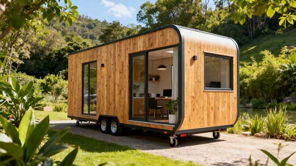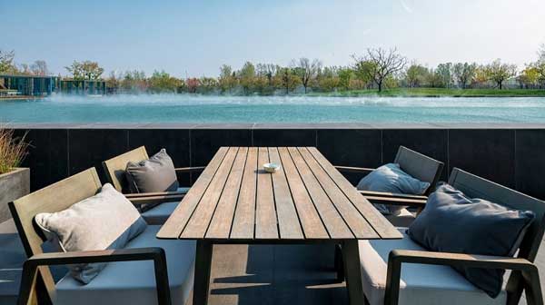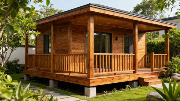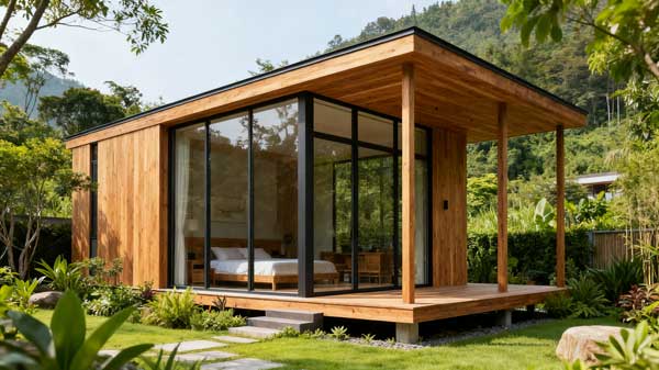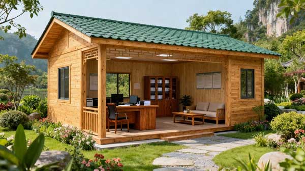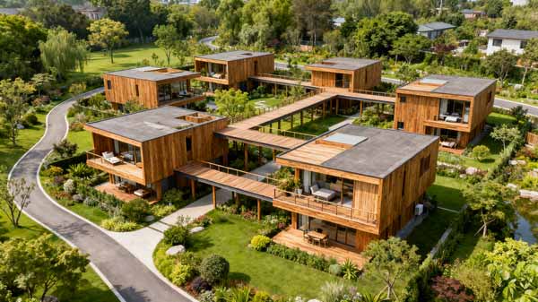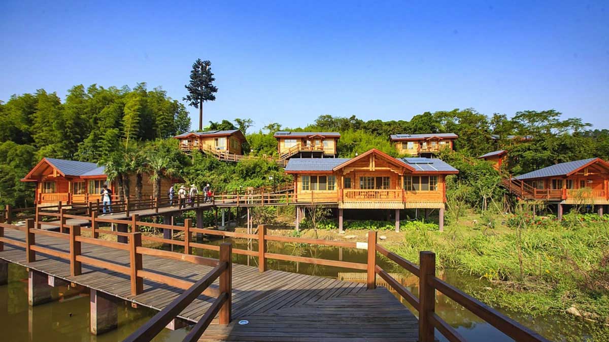 为度假村打造 12 栋轻型防腐木民宿,采用樟子松防腐木,结合现代简约风格与自然环境,配套木平台与花架,实现居住舒适度与生态美学的平衡。